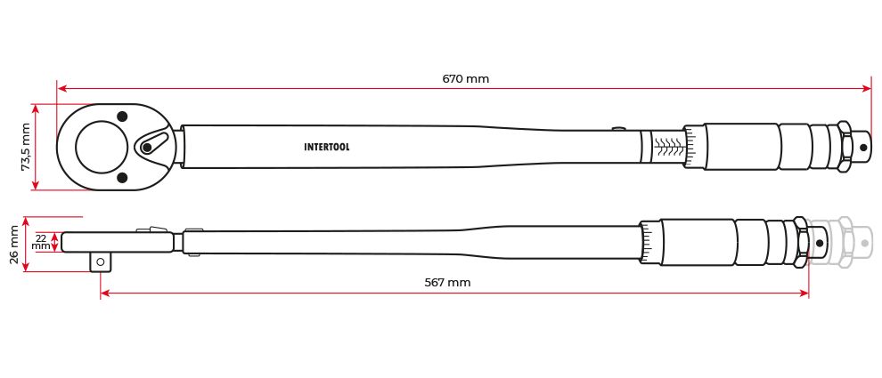 Ключ динамометричний має реверс, працює на затягування лише праворуч. Зручне регулювання крутного моменту з подвійною шкалою (Фут/фунт та Н/м) легко зчитується. Стопорна гайка на торці ключа фіксує налаштування значення крутного моменту, поки ви працюєте.
